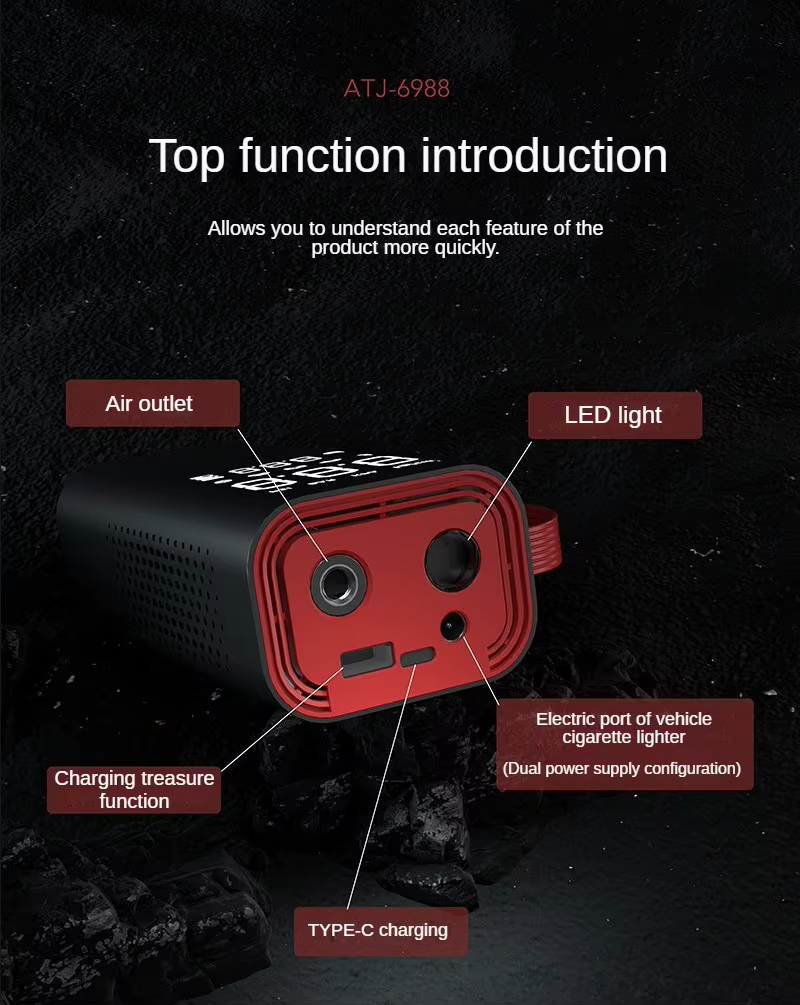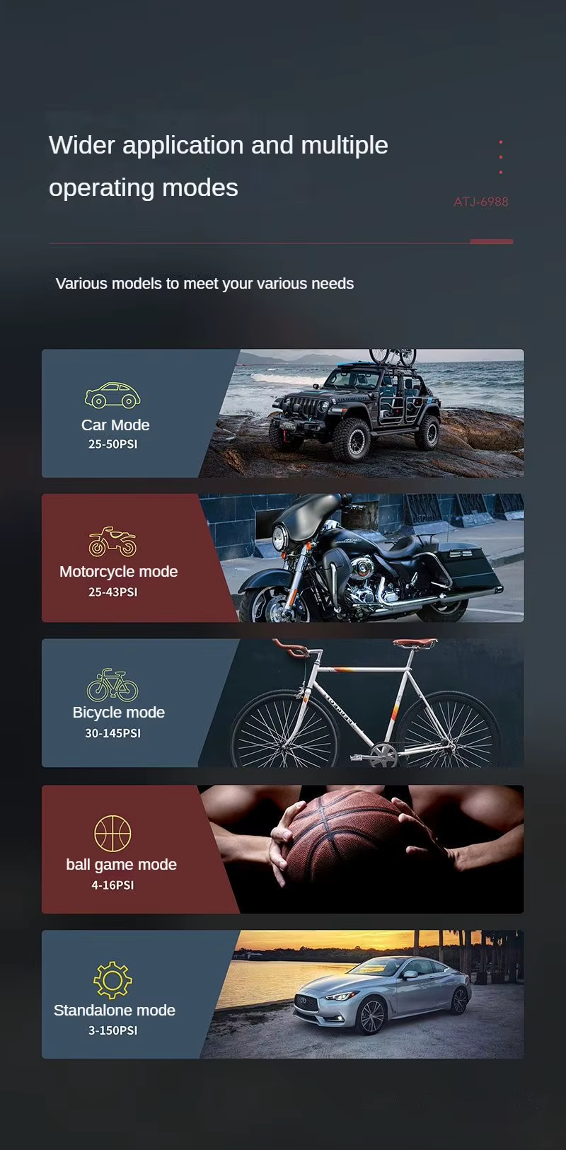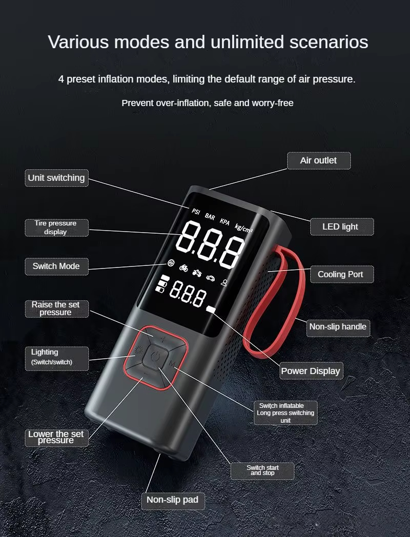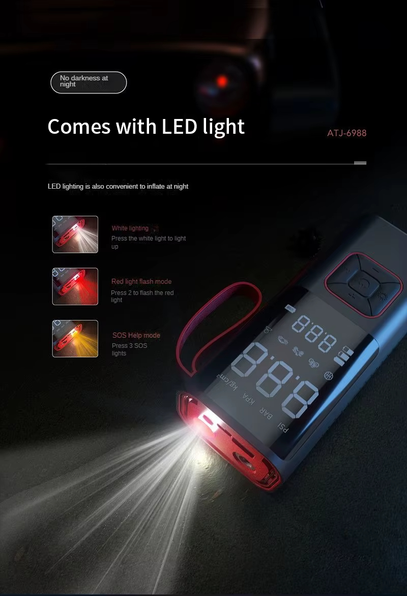 – Outil multifonction : cette pompe gonflable portable n’est pas seulement un gonfleur. Elle combine gonflage,éclairage,mesure de la pression,pression des pneus prédéfinie et fonctions d’urgence SOS. La multifonctionnalité garantit que vous êtes prêt pour plusieurs scénarios sur la route.