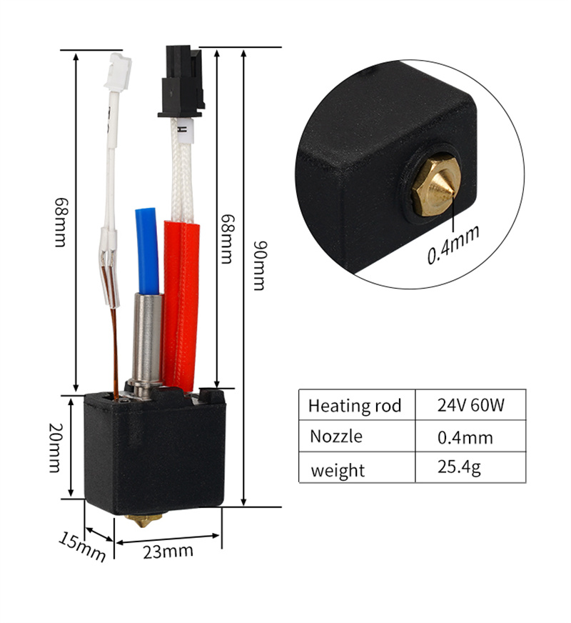 4. Résistance à haute température : La tige chauffante fonctionne à 24V 60W,lui permettant d’atteindre rapidement des températures élevées et de maintenir des performances stables pendant des sessions d’impression prolongées. Cette capacité à haute température prend en charge l’utilisation d’une variété de filaments,y compris ceux nécessitant des points de fusion plus élevés.