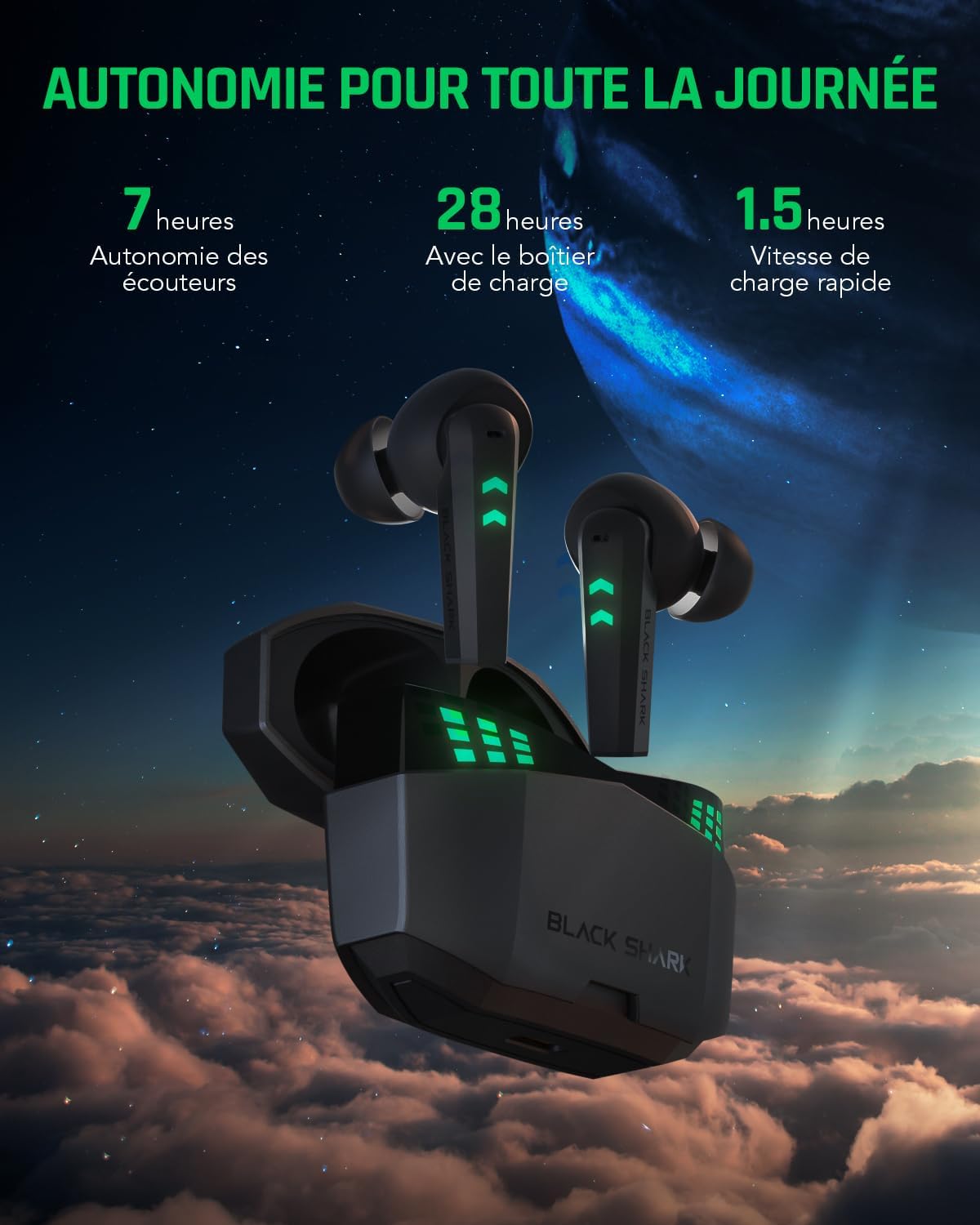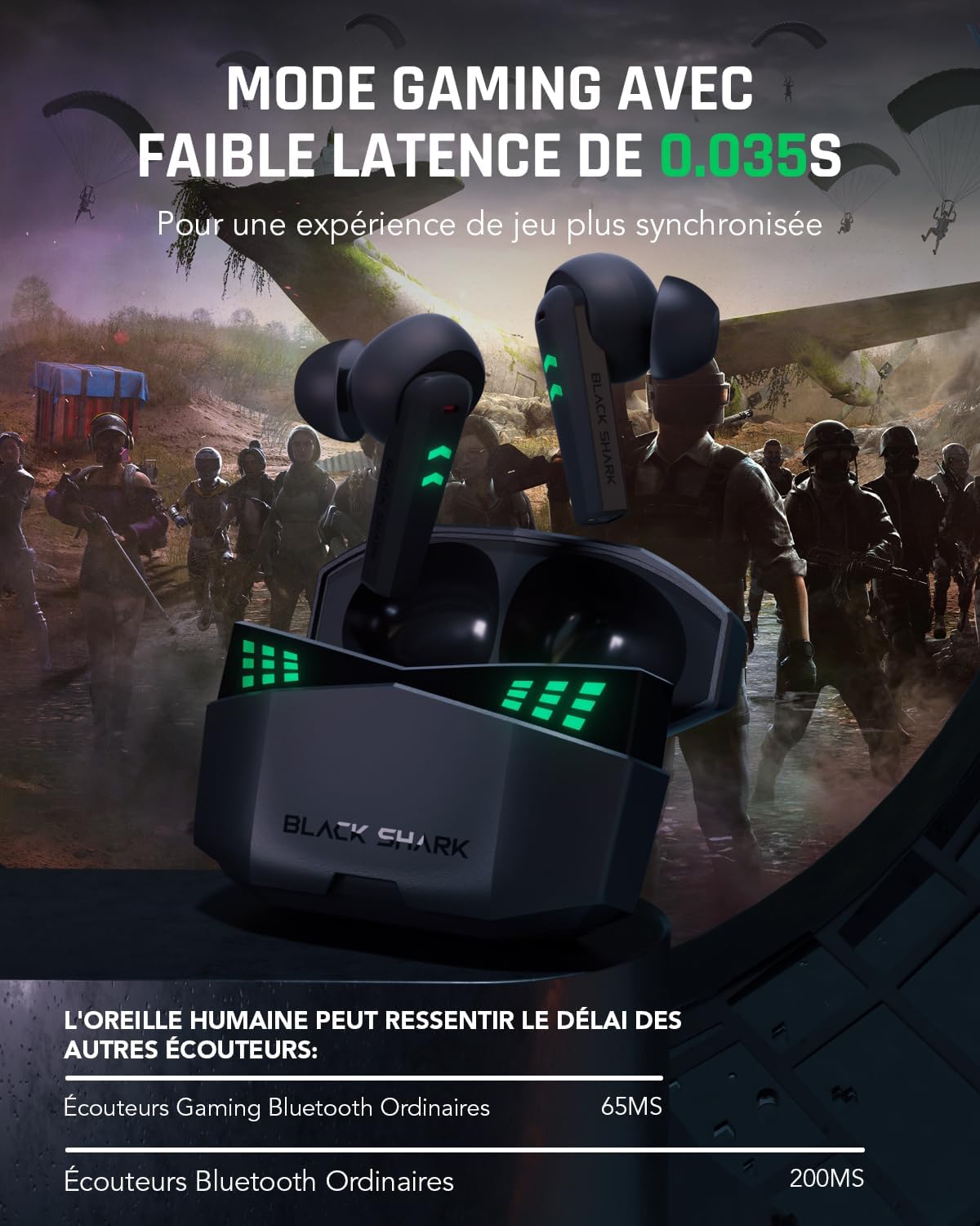 【𝐋𝐚𝐭𝐞𝐧𝐜𝐞 𝐔𝐥𝐭𝐫𝐚-𝐟𝐚𝐢𝐛𝐥𝐞 𝐝𝐞 𝟎,𝟎𝟑𝟓𝐬 & 𝐒𝐨𝐧 𝐆𝐚𝐦𝐢𝐧𝐠 𝐒𝐩𝐚𝐭𝐢𝐚𝐥】 : Activez le Mode Gaming pour utiliser les performances ecouteurs Bluetooth sans fil Black Shark Lucifer T6 lors de vos parties classées et réagissez ou visez plus rapidement grâce à un son et une image encore plus synchronisée. Entendez les ennemis qui se faufilent derrière vous au son gaming spatial