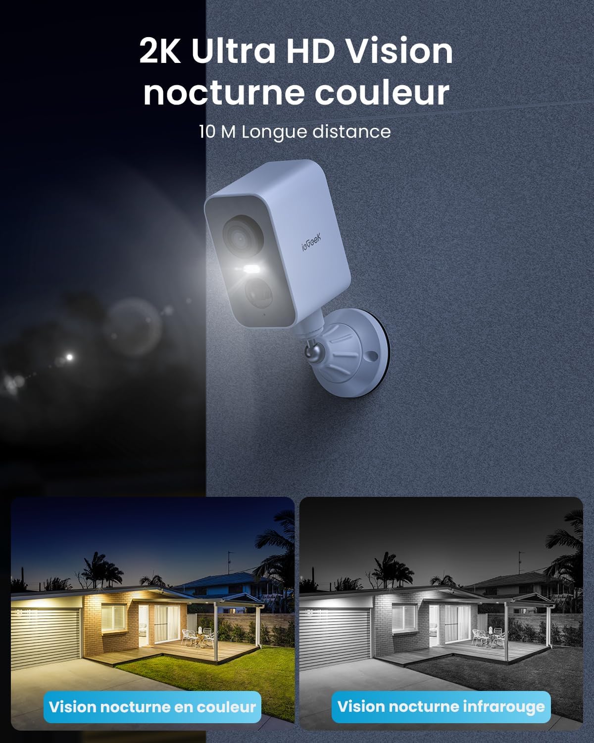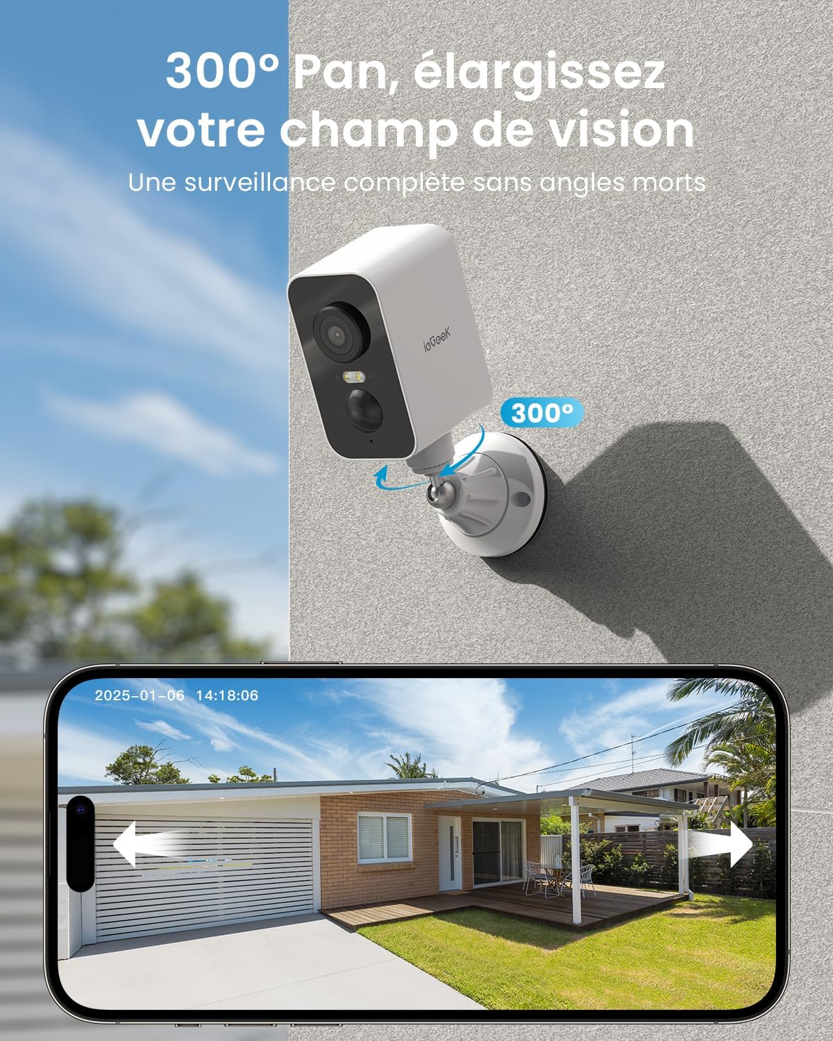 【Champ de vision orientable à 300°】La nouvelle camera exterieur sans fil ieGeek dispose d’un champ de vision rotatif.Avec 300°Pan, la caméra de surveillance offre des vues panoramiques de tous les coins ; 2 LED PIR et 2 lumières blanches, un objectif grand angle de 130° et une portée de vision nocturne de 10 mètres vous permettent de surveiller des environnements plus éloignés, plus larges et plus lumineux, de jour comme de nuit
