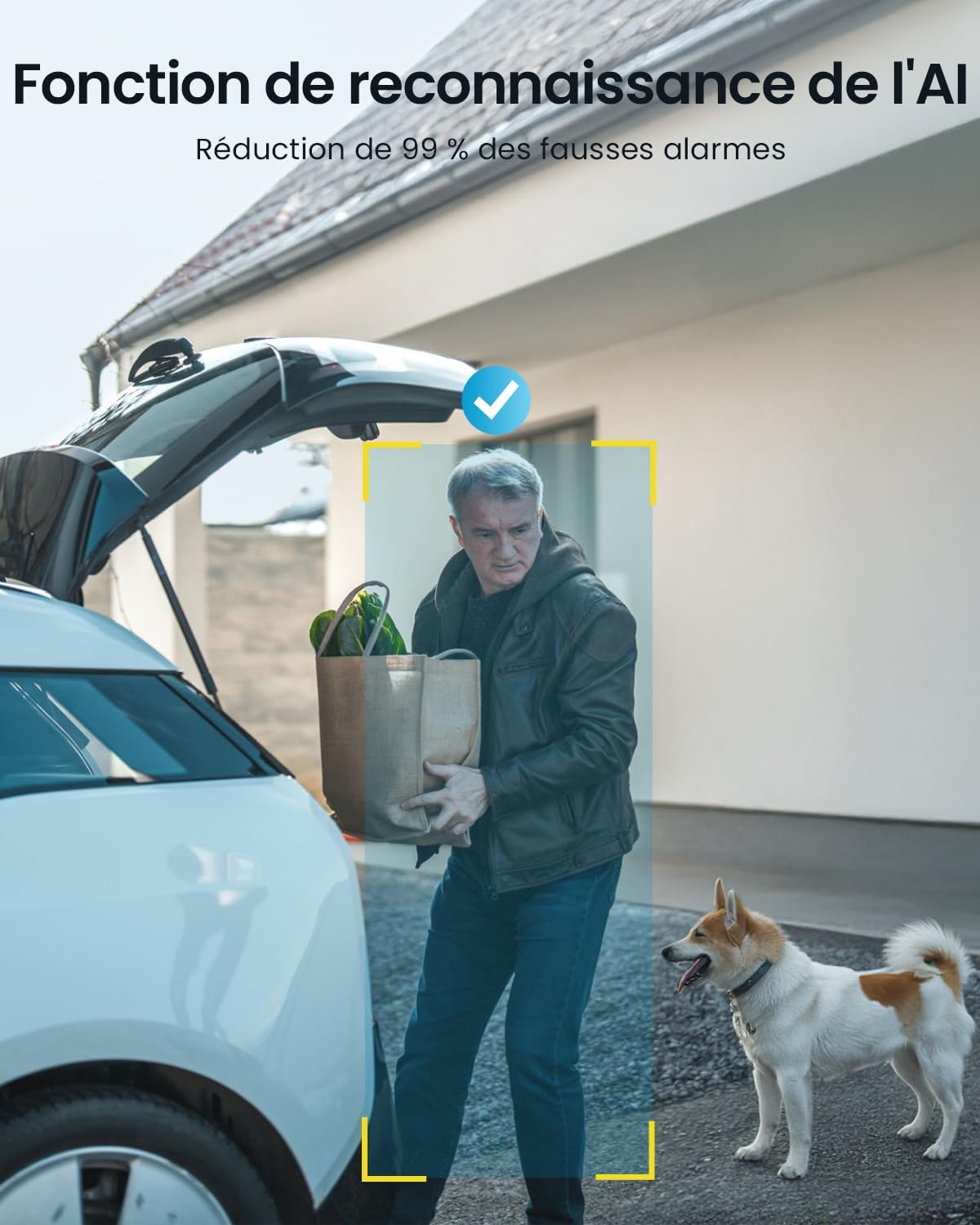 【Détection de mouvement AI/PIR et notification d’alarme en temps réel】Le système avancé de détection rapide AI/PIR de camera de surveillance exterieur reconnaît les individus et transmet des alertes entre 0,2s et 3s ; il offre également la possibilité d’un avertissement déclenché automatiquement ou manuel sirène pour décourager les intrus