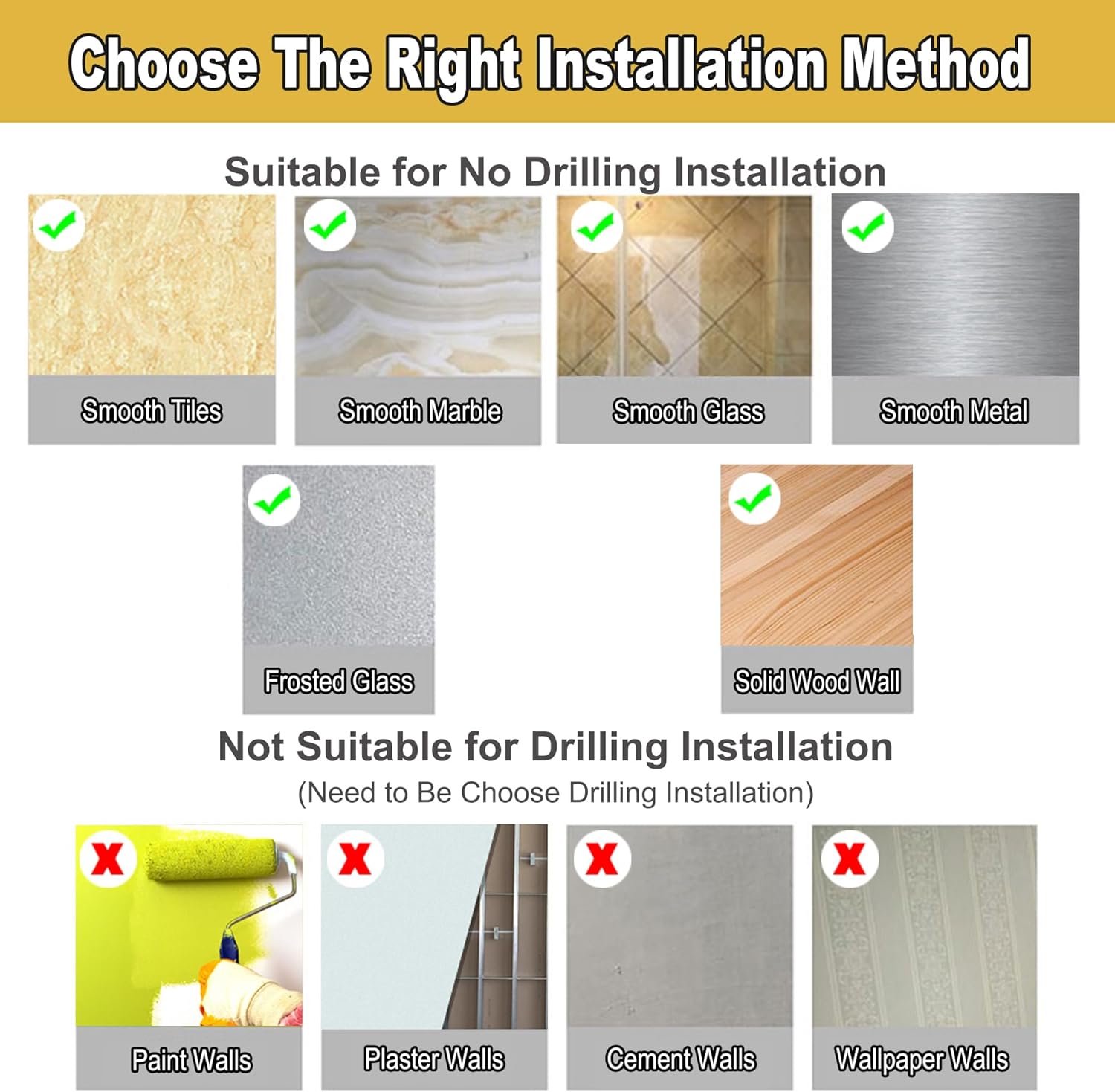 Étagères Salle de Bain comprend des accessoires d’installation sans perçage et des accessoires d’installation de perçage, vous pouvez choisir la méthode d’installation appropriée en fonction du mur à installer