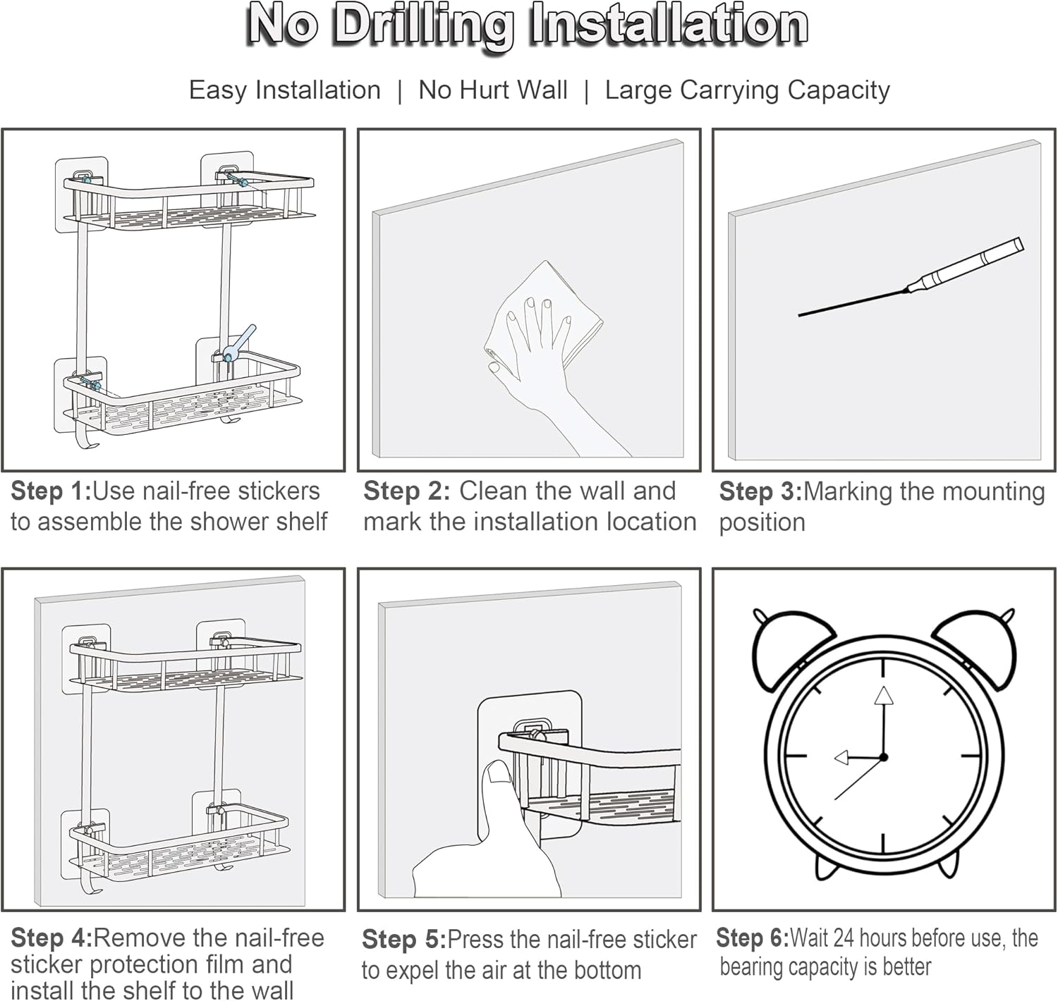 ♦ [SANS PERÇAGE, PAS DE BLESSURE AU MUR] Étagère de Douche murale est installée avec un autocollants sans clous.Ce qui est une installation simple.Utilisation à long terme, pas facile à tomber.Peut transporter plus de 10 kg 22 lb.