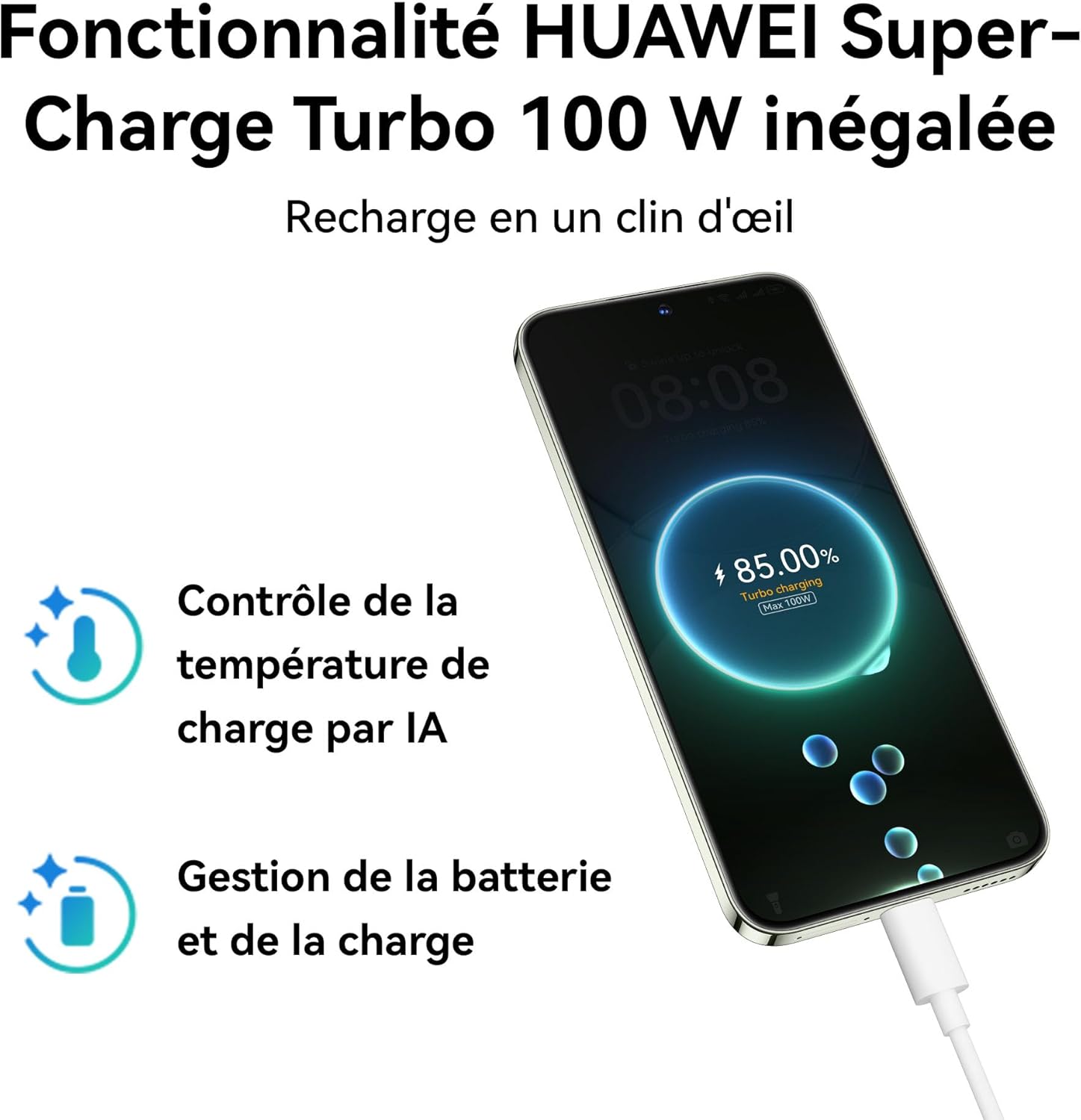 100 W HUAWEI SuperCharge Turbo: Équipé d’une puissante batterie de 5 000 mAh8, cet appareil offre une énergie inépuisable. Grâce à la fonctionnalité HUAWEI SuperCharge Turbo 100 W1, il atteint une puissance de 50 % en seulement 10 minutes