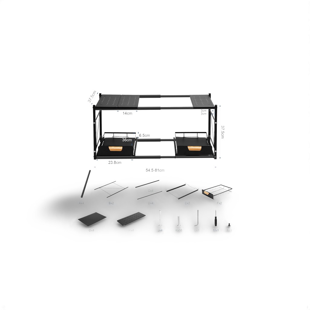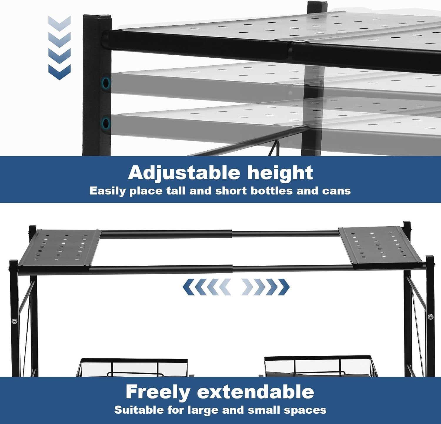 Design réglable en longueur et en hauteur : l’organiseur de meuble sous évier mesure 54,5 x 37,5 x 37,5 cm L x l x H et la longueur peut être réglée de 54,8 cm à 81 cm de manière télescopique Le tiroir inférieur peut contenir des bouteilles de 36 cm de haut, ce qui peut utiliser efficacement l’espace vertical pour ranger les produits de nettoyage, les aliments, les cosmétiques, etc.