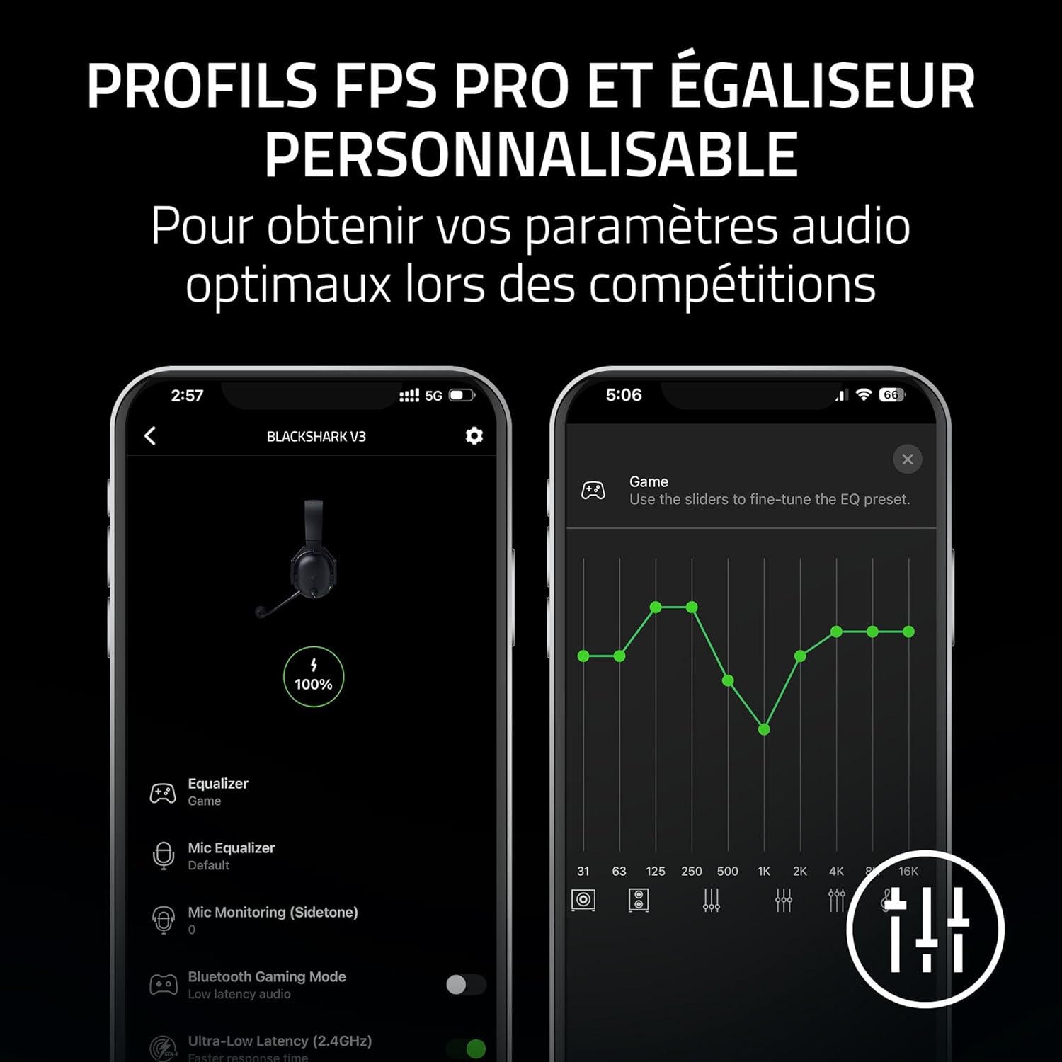 Profils FPS pro et égaliseur personnalisable – pour obtenir vos paramètres audio optimaux lors des compétitions: Améliorez votre expérience audio grâce à des profils d’égalisation réglés avec précision par les champions esport de Razer, ou créez vos propres égaliseurs et enregistrez-les pour les amener partout.