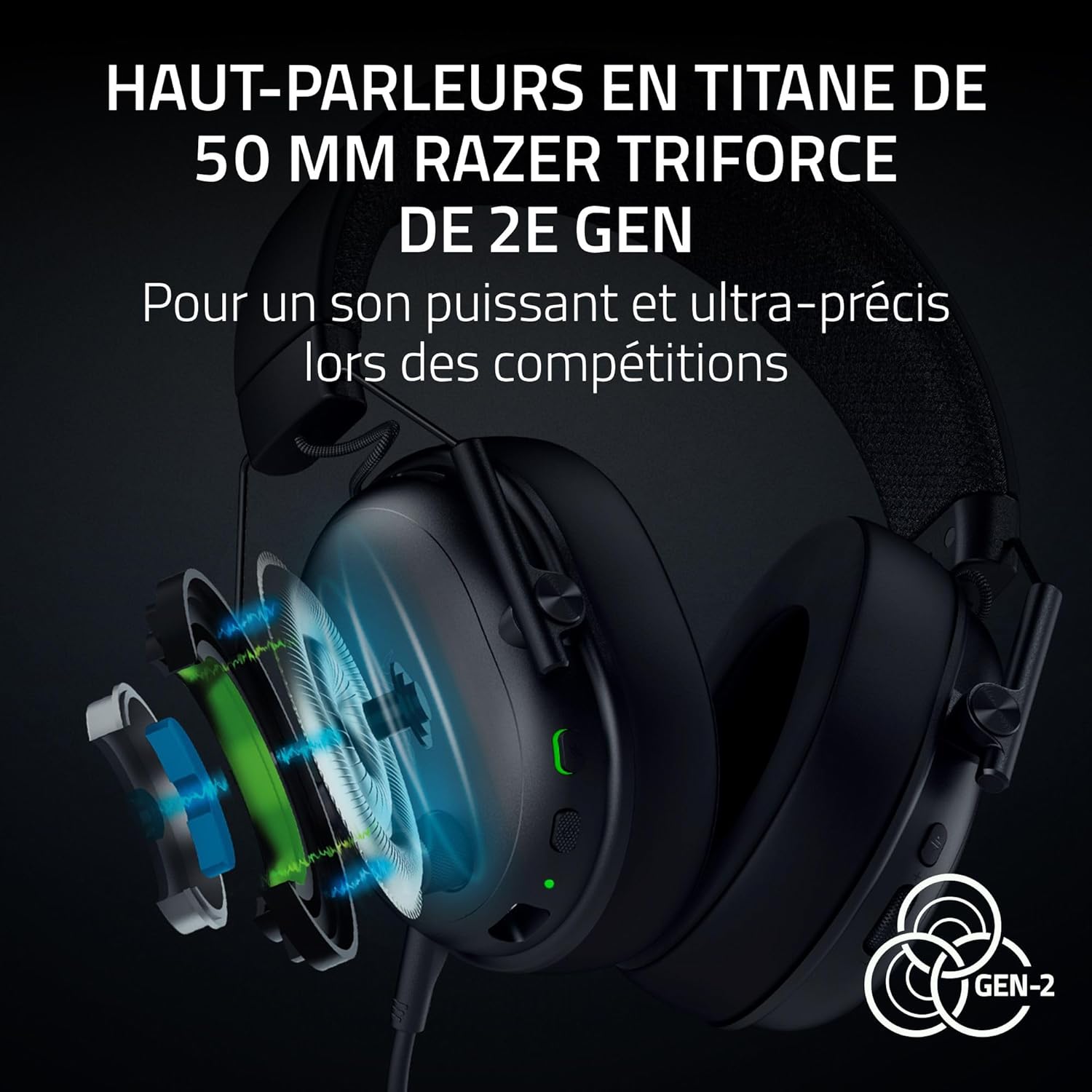 Haut-parleurs en titane de 50 mm Razer TriForce de 2e gen – pour un son puissant et ultra-précis lors des compétitions: Clarté et localisation améliorées : les haut-parleurs de 2e gen sont dotés d’un diaphragme très réactif revêtu de titane qui reproduit tous les sons avec un niveau de détail stupéfiant.