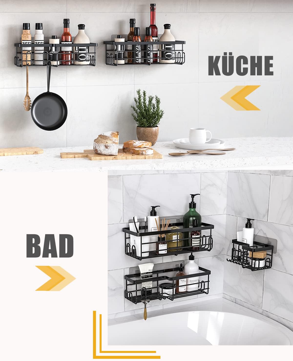🧼Adhésifs Super Puissants : l’étagère de douche est auto-adhésive, sans perçage ni dommage au mur. Elle est plus durable et puissante que la ventouse. Un adhésif puissant garantit que l’étagère de la salle de bain est stable, peut supporter l’étagère et les objets lourds sur l’étagère, qui peuvent supporter jusqu’à 20 kg. Placez les ustensiles de bain ou les ustensiles de cuisine sur le support de douche, il maintient toujours l’équilibre sans basculer